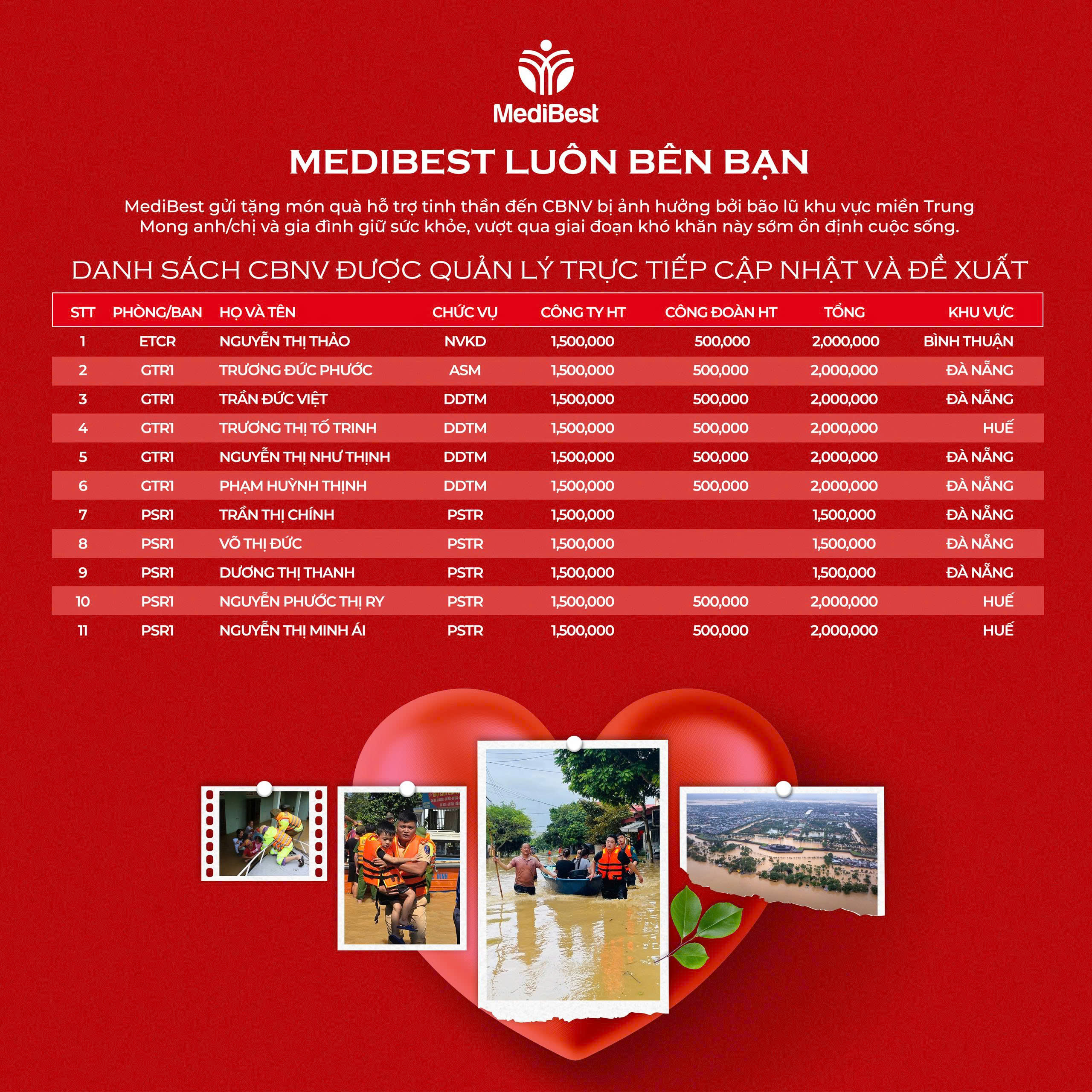 Những ngày vừa qua, miền Trung thân yêu từ Huế, Quảng Ngãi, Quảng Nam Đà Nẵng đến Bình Thuận đã trải qua những trận mưa lũ khắc nghiệt. Không chỉ là thiệt hại về nhà cửa, mùa màng, mà còn là những thử thách lớn đối với cuộc sống của nhiều gia đình, trong đó có các anh/chị em CBNV MediBest.